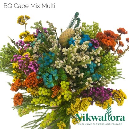 Bouquet with mix of multi tinted and natural foliage and greens.